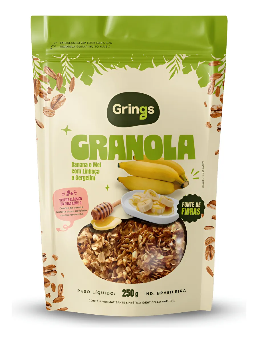 Ingredientes: Aveia em flocos, açúcar demerara, flocos de arroz, extrato de malte, fibra de trigo, flocos de milho, germe de trigo, farinha de soja, uva passa, maltodextrina, óleo de girassol, banana desidratada em pó, linhaça, gergelim, açúcar mascavo, mel, aroma idêntico ao natural de banana e antioxidante tocoferol (natural).