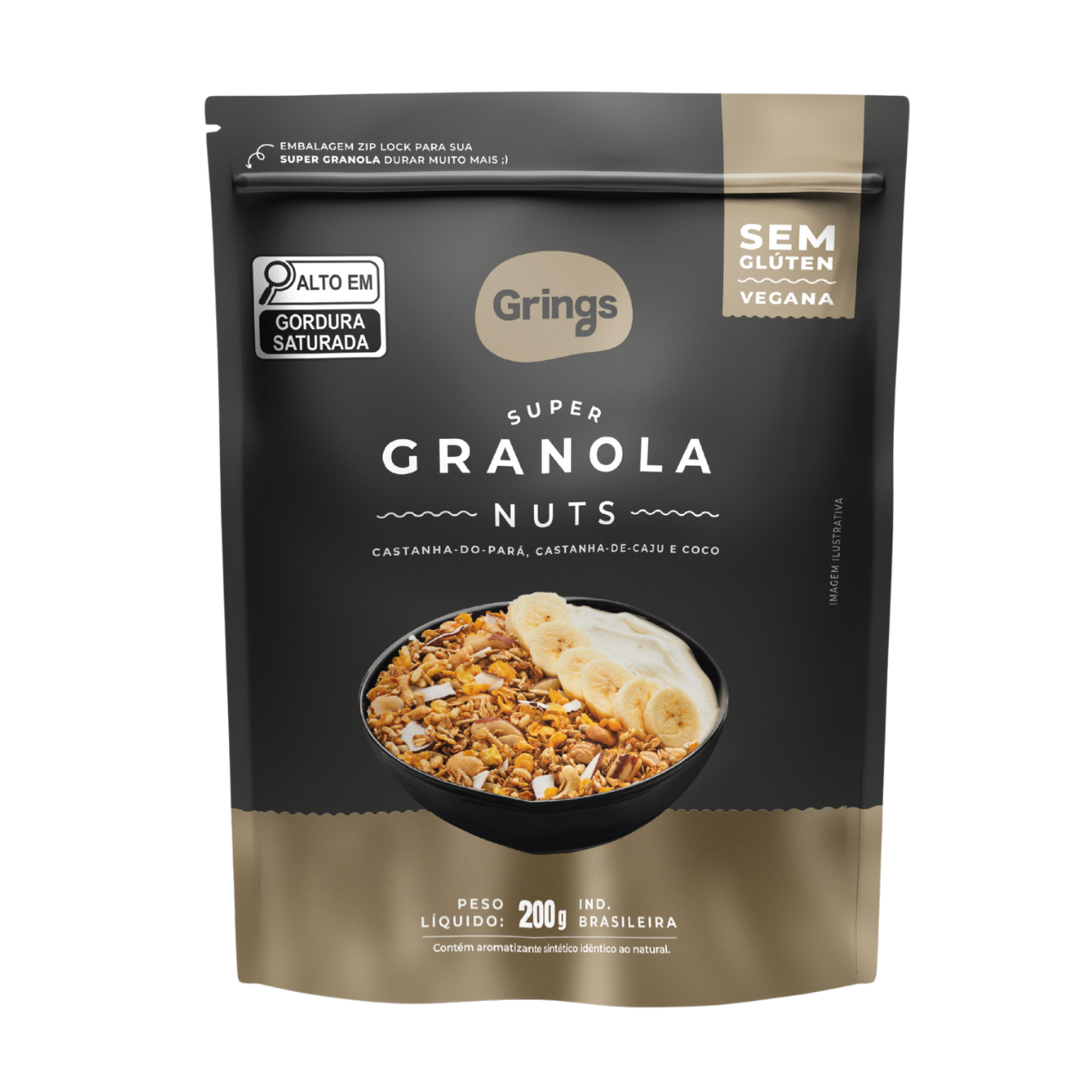 INGREDIENTES: aveia em flocos, semente de girassol, açúcar demerara, coco desidratado, castanha de caju, gergelim, flocos de milho, castanha do pará, flocos de arroz, coco em lascas, açúcar mascavo, melado de cana, xarope de arroz, óleo de coco, aroma idêntico ao natural de mix de nuts e antioxidante tocoferol (natural).